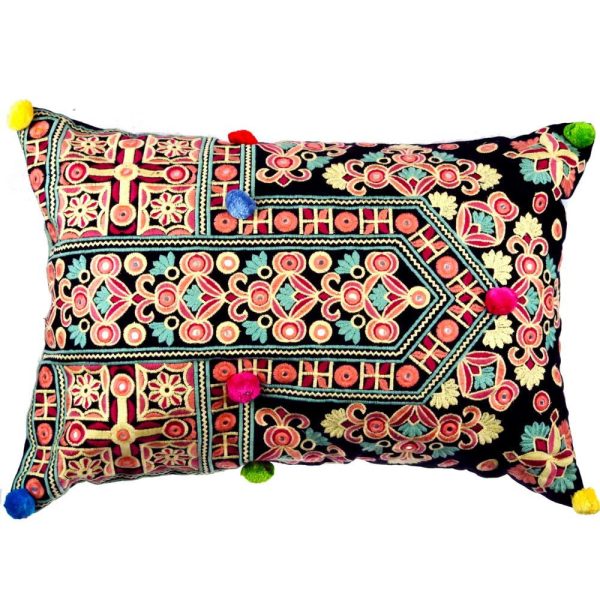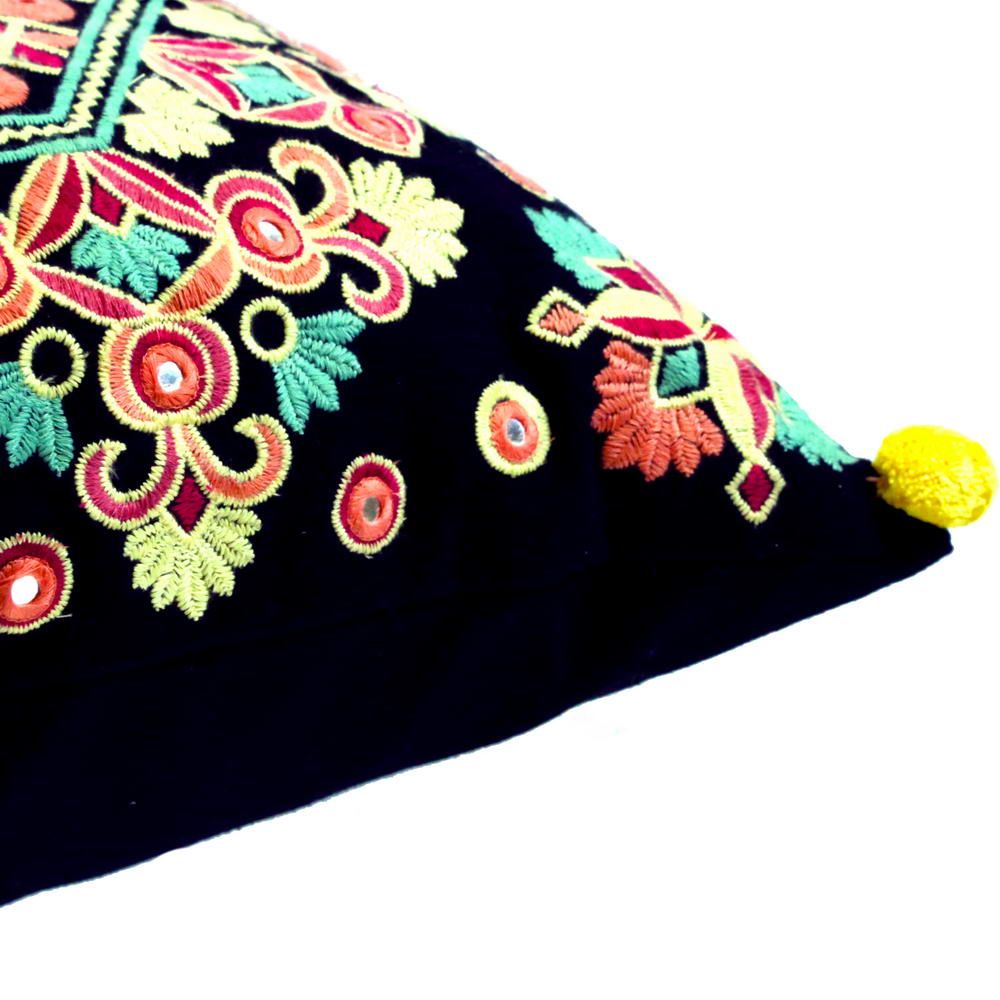 Χειροποίητο βαμβακερό διακοσμητικό μαξιλάρι καναπέ με πλούσια κεντήματα, μικρά καθρεφτάκια, πομ πομ και άλλες λεπτομέρειες που το κάνουν να ξεχωρίζει ανάμεσα στα μονόχρωμα μαξιλάρια του καναπέ σας και δίνει μια λαμπερή Boho πινελιά.